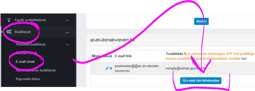 Ha eddig az “info@az-én-domain-nevem.hu” email címről küldted a rendelés visszaigazoló emaileket, de ezt az email címet még nem hoztad létre, semmi, gond, itt az ideje, hogy létrehozz egy ilyen email címet. A Beállítások –> Email címek menüben en-domain-nevem.hu